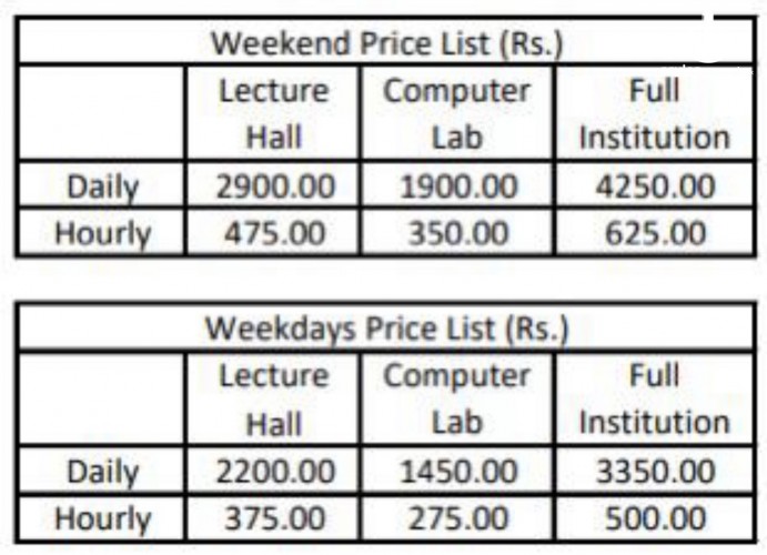 Fully furnished education institute (1000 sqft) with lecture hall for 30 to 35 students, computer lab for 20 students, reception, pantry and washroom facilities situated at the main Street Matale is available for daily / hourly basis renting for tuition classes, computer classes and/or any other educational/training/promotional programs. Long term contracts can be reached.