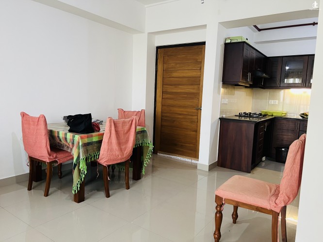 • Sofa set with a coffee table, dining table with four chairs, refrigerator, two small tables for work.
