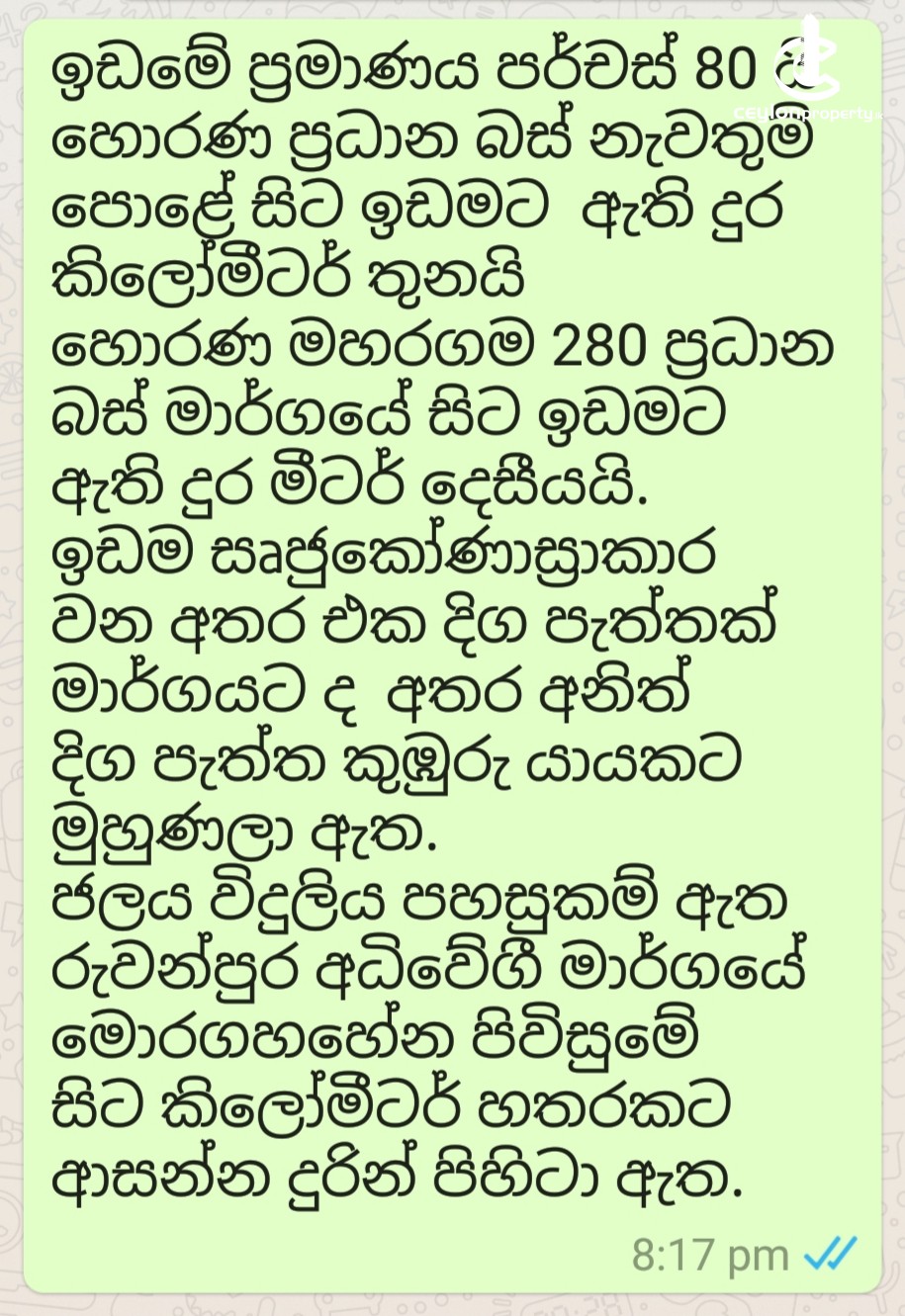 # හොරණ මහරගම 280 ප්‍රධාන බස් මාර්ගය ආසන්නයේ සිට මීටර් 200 ක දුරකින් ඉඩම පිහිටා ඇත