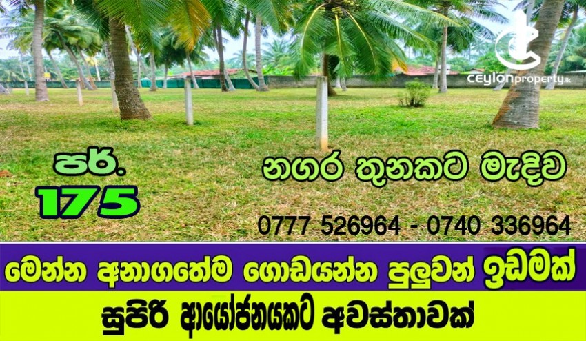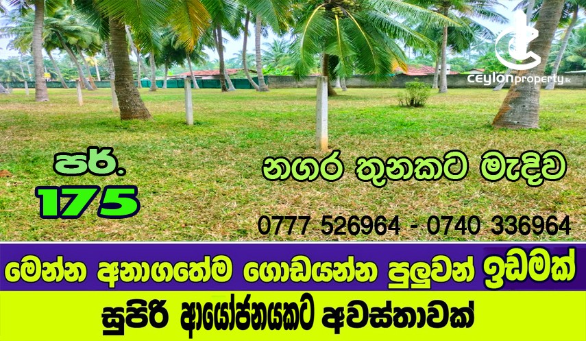 ව්යාපාරයට- පදිංචියට සුදුසු පර්චස් 175ක් විශාල,අලංකාර ඉඩම එකවර විකිණීමට... වටිනාම ආයෝජන අවස්ථාවක්.....ප්රධාන පාරේ සිට කන්ටේනර් රථ හෝ විශාල වාහන ඉඩමට ඇතුල් කිරීමේ හැකියාව සහිතයි.....ගෙවන මුදලට වඩා වටිනා සාධාරණ මිලකට. tel; 0777 52 69 64--------0740 33 69 64-- පර්චසය ලක්ෂ 350000 යි...මිල සාකච්ඡා කල හැක ....පළමු ගැණුම් කරුට විශේෂ වට්ටමක්... # ගෙඩි කැඩෙන සාරවත් පොල්ගස් 39කට වැඩි ප්රමාණයක්. # ස්වාභාවික ආපදා වලින් තොර ප්රදේශයක් බව වගකීමෙන් පවසමි.. # කොටස් කිරීමට - නිවාස සංකීර්ණයකට- ගබඩා සංකීර්ණයකට- කන්ටේනර් රථ ගාල් කිරීමටද සුදුසු වේ. away from Kochchikade town in Negombo ...