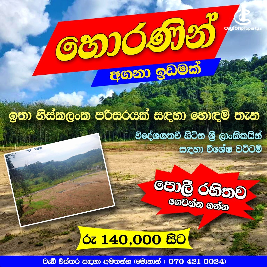හොරණ බැල්ලපිටිය,කදන හංදියට ආසන්නයේ හොදම ඉඩමක්.හොරණ නගරයටත් ,බන්ඩාරගම ,පානදුර නගරයටත් මැදිව.420 රත්නපුර - හොරණ මාර්ගයට විනාඩි 15 ක දුරින්.සියලුම නාගරික පහසුකම් වලින් සමන්විතව.අතේ ඇති මුදලට හොදම ඉඩම